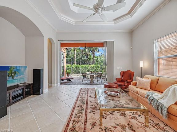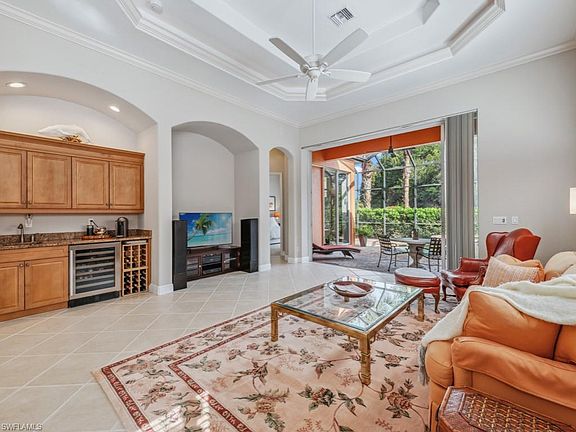Welcome to this attractive Single Family "Martinique floor plan" for the price of some condo's in The Strand! Yes, your very own four walls with no overhead noise transfer from an upper unit. Meticulously maintained 2 bedroom + den, with it's own private, charming outdoor space, complete with a dipping pool and spa. The high ceilings throughout this residence truly make the home feel like it's larger then it's square footage. All interior doors are 8' tall. Foyer ceiling is 15' high, with an incredible 12' being the lowest ceiling height in the home. All windows are hurricane rated, with 10' sliders being storm rated. Transom windows allow natural light to stream in and make this home bright and pleasant. The roof was replaced in 2022, and the screened pool enclosure updated. A new gutter system was installed in 2023. Crown Molding is present in all main living areas. A convenient wet bar/beverage area makes the living/dining area into an elegant entertaining space. Just far too many great features to mention here. Mango Cay is a charming enclave of single family homes with a desirable location; it allows for quick access to the shopping, dining and professional offerings nearby. Enjoy an active country club lifestyle, complete with 3 beautifully maintained 9-hole golf courses, tennis, pickleball, all new fitness center, and an impressive pool with lap lanes, newer bocce courts, as well as a recently added croquet center and Island Bar for residents to enjoy. The clubhouse next door to the Jr. Olympic pool houses two upscale restaurants: one upstairs, and the downstairs Tavern 59 restaurant opens into botanical garden/outdoor wedding venue location. The sugar sand beaches of the Gulf a straight shot down Immokalee Rd.