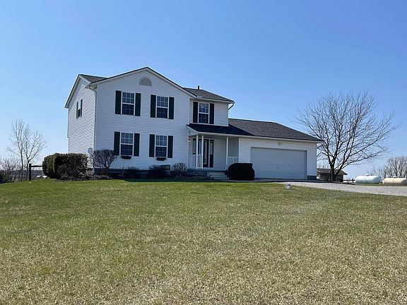 Warm, welcoming, and beautifully updated 3 bedrooms, 2.5 bath country home situated on 2.5 acres. It's love at first sight when you pull up and see this beautiful two-story home perched up and back off the main road overlooking its beautiful county location. This move-in ready home has so much to offer beginning with the open foyer leading to the spacious living room, and the open concept kitchen/dining/ family room with a gas fireplace. You could also go straight upstairs where you'll find 2 nice size bedrooms, a master bedroom with en suite and a walk-in closet, a second full bath, and a very convenient laundry room. There is 2134 sq. ft. of living space plus an additional and very usable, 874 sq. ft. basement which houses an impressive whole house water system, newer furnace, and hot water tank. The backyard is a must-see outdoor living space made for entertaining guests of all ages; a gorgeous concrete patio with a fire pit, strings of lights, and a gazebo, There's a zip line and a designated play area for the kiddos and plenty of room to run with an enclosed with a fence to keep them safe. This Peaceful country setting has wildlife sightings, incredible sunsets, and meteor showers in the summer. Updates since owning include: Carpet, kitchen appliances, an impressive water system that's a must-see, roof, furnace/heat pump, hot water heater, well pump, pressure tank, concrete patio, fire pit, fence, life proof flooring in the kitchen, living room and foyer, and kitchen/bath remodel.
