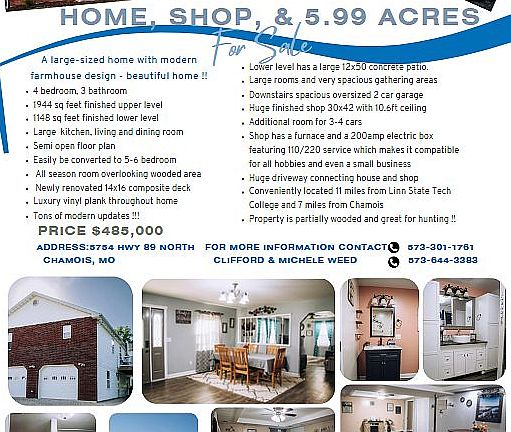 Modern Farmhouse Style, extra large rooms, oversized garage, luxury vinyl plank flooring throughout home, new composite deck upper level; all season room, concrete patio on lower level that is 12x50, very spacious downstairs family room, huge space for parking that connects the house to the shop, HUGE kitchen with tons of cabinets and a lot of highway frontage with partially wooded acres behind our home. Great for hunting !! Our home location is very peaceful and offers privacy for your family gatherings. Enough space to have a small farm or gardening if desired. Shop details: size 30x42 with 10ft 6in ceilings, equipped with 200amp breaker box with electric throughout, it is fully finished with OSB sheeting. Great space for small automotive shop, hobbies, or small business. Extra building includes a 10x16 storage building for mowers, with oversized ceiling including a loft area. We are 3 minutes away from Ben Branch conservation lake and hunting property, 11 minutes from Linn State Technical College, and 7 minutes from Chamois for public access to Missouri River - prime location for all of your extra curricular activities.