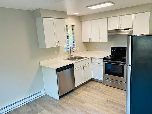 Recently remodeled 2bd, 1ba lower level unit with patio. Living room has decorative stone fireplace, LVP flooring and large window - perfect for natural light. Kitchen features slab quartz countertops, ample white cabinetry and stainless appliances. Dining nook with slider to patio - great for bbq or enjoying a morning coffee. Two ample sized bedrooms with plush wall to wall carpeting and individual heating controls - save on the electric costs! Full size washer and dryer in unit. Bathroom with shower/tub combo and vanity with storage. Off Street Parking and a pet is negotiable with references and deposit. No pet rent! A definite must see! Call today for more information and details! 1 year lease