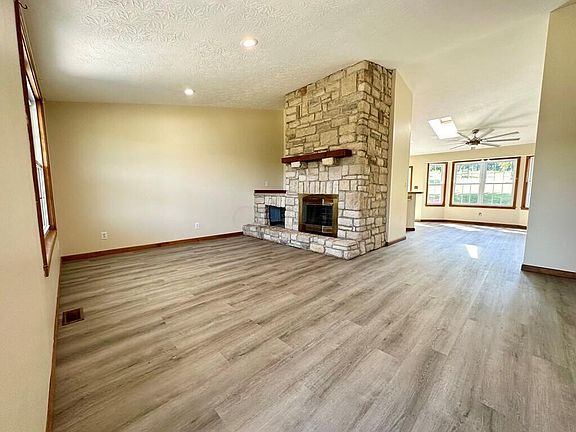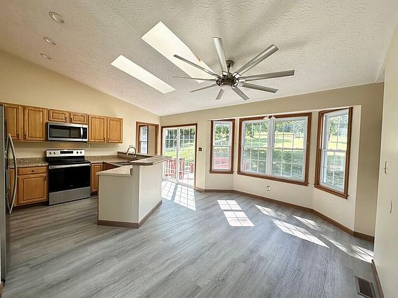 Check out the beautiful views from your covered front porch at this site built home! Enter into the living room featuring vaulted ceilings and a stunning floor to ceiling custom, stone fireplace. Continue into the airy kitchen with a custom tile bar, skylights, bay window, a walk in pantry and brand new stainless steel appliances. Down the hallway you'll find a full bath with a walk in shower, 3 nice size bedrooms with new carpet and big closets and a huge master bath offering an additional linen closet. Through the new slider enjoy your backyard views from the deck. This property also offers a 2 1/2 car attached garage and a storage building. Brand new paint, flooring and heat pump are featured throughout this amazing home. *Water and electric at the rear of the property
