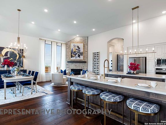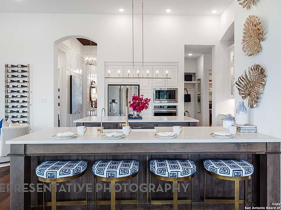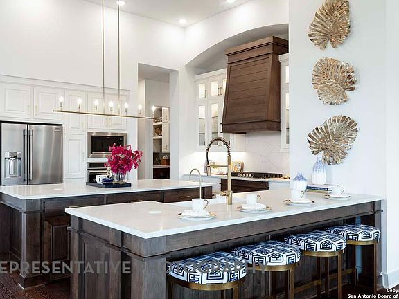 MODEL HOME PLAN & ELEVATION. Includes four bedrooms with on suite baths on each, making it the perfect home for hosting guests. The heart of the home is a gourmet kitchen, outfitted with top-of-the-line appliances, custom cabinetry, and an two oversized islands that seamlessly flows into an expansive open-concept living and dining area. Enjoy a Texas size patio, perfect for relaxing and entertaining.