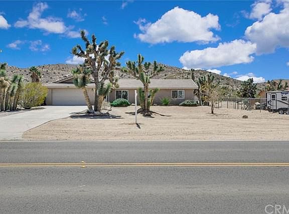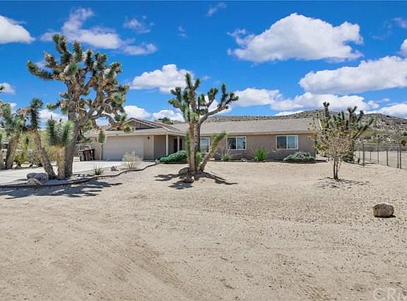Great Ranch style home in Yucca Valley . Large lot of just under 1.5 acres with spacious front and backyards featuring easy care landscaping. Enter into the living room that boasts plenty of light and open floor-plan. The adjoining dining room has a sliding glass door, offering a great view of the yard and nearby mountains. To the right is the updated kitchen with stainless steel appliances, granite countertops, and an beautiful backyard view from the kitchen. Separate laundry room off the garage with cabinetry and shelving. Master bedroom is located on one side of the home, allowing for privacy . The hallway and remaining bedrooms can be found on the opposite side of the house, just off of the living room area. There is a separate bathroom for guests. The first bedroom has wood laminate flooring and can also be utilized as an office or den. There are two bedrooms at the end of the hallway, one of which is an additional master suite and has a sliding door with backyard access. The home features ceiling fans, recessed lighting, tile floors in kitchen and bathrooms, and carpeting throughout. bathrooms have granite countertops and bathtub/shower combos. The large backyard has a generous-sized patio with plenty of room for all of your outdoor furniture, Including large RV parking on the side of the home along with hook ups for electricity and dump station. Great area for entertaining and holding outdoor gatherings during the spring and summer months.