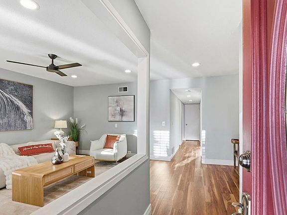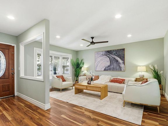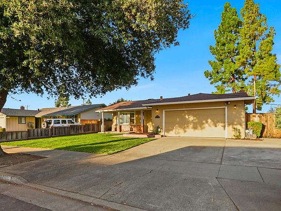 The family room centers around a stunning fireplace. The primary suite features a remodeled bath with an elegant vanity, a quartz slab countertop, a stylish tile surround, and tile flooring. The hall bath is similarly refreshed with tub-over-shower. Additional upgrades include new flooring throughout, new heater & A/C, new water heater, recessed lighting, updated light fixtures, dual-pane windows, and a SunRun leased solar system for energy savings.