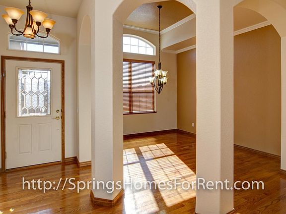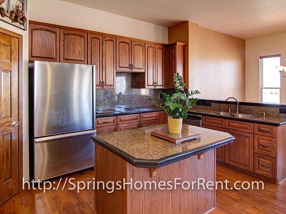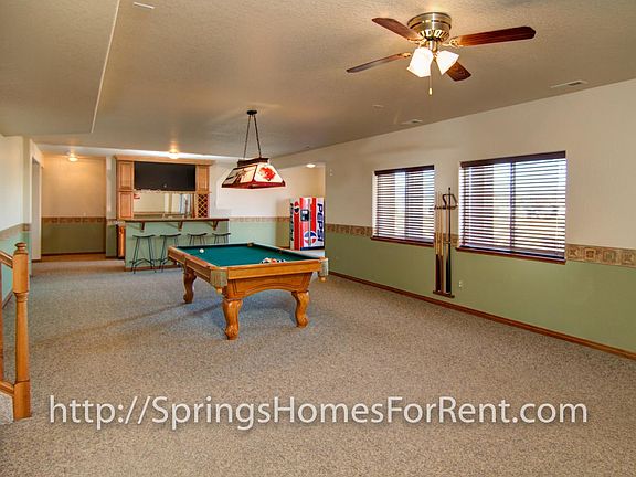 Stunning 5 bedroom ranch home with even more stunning Pikes Peak and Front Range views. Plenty of natural light, wood flooring, open concept, and a dream kitchen accompany two bedrooms on the main level. Main level bedrooms include a spacious master with deluxe en suite bathroom featuring whirlpool tub, separate sinks, and California closet, along with an office on the main floor. Three large additional bedrooms are found in the basement, each with its own walk-in closet and plenty of storage space. Also in the basement is a large family room, featuring a wet bar and walk out to the fenced backyard. There is great space for entertaining, inside and outside at this welcoming property. This rental feels like a true home!