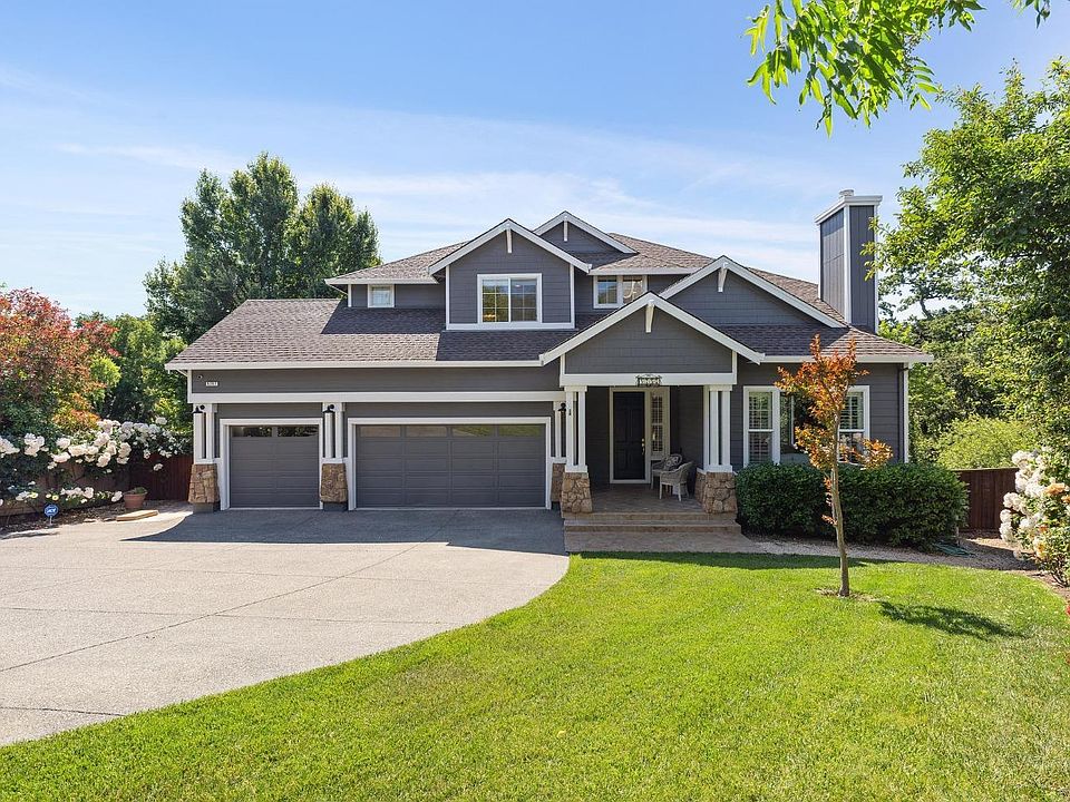 Beautiful Skyhawk home situated on approximately third an acre flag lot with enchanting backyard landscaping with wandering paths, amazing roses, secret gardens, serene lounge area. Away from the road allows for privacy plus a large level front yard area with lawn & welcoming entry. This home features on the main level a dramatic formal entry, high ceilings, formal living with fireplace, dining room with views, gourmet kitchen with large island & plenty of storage, separate breakfast area, breakfast bar, relaxing family room with fireplace & access to the backyard, bedroom with adjacent full bath, as well as spacious laundry room with sink & views. Cascading staircase takes you to the second level featuring primary bedroom suite with high ceilings, views, large ensuite bathroom, soaking tub with views & large walk-in closet, as well as an additional bedroom, large media room/possible bedrooms, loft office and a second full bath. Property is situated to take in spectacular sunsets from the ample deck perfect for entertaining. Extra deep three car garage with plenty of additional built-in storage. Gateway location to the fantastic Sonoma Wine Country. Close to the award-winning schools, pedestrian paths, hiking/biking trails, open space, amazing parks, restaurants, shopping & golf
