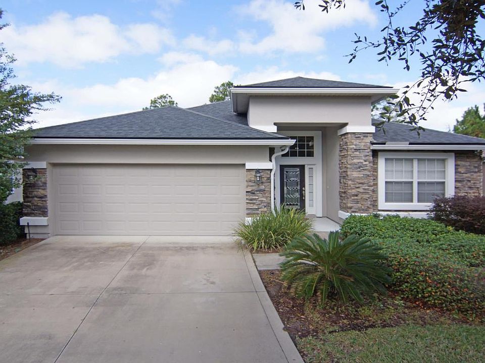 This home with great curb appeal & great open floor plan has been meticulously cared for & is move-in ready! It features, 2,042 sqft., 3 BR & 2 BA & is in the desirable community of Bartram Springs. The Kitchen has Corian counters, tile backsplash, tile floors, raised panel cabinets with brushed nickel pulls, breakfast counter & under cabinet LED multi-colored lighting. The Great RM has a fireplace with built-in cove area for your electronics, Fireplace & large sliding doors to the covered porch & backyard patio. The Master Suite is spacious & faces the backyard & covered Porch. With its own large private bath, dual sink vanity, shower and tub & big walk in closet. Formal Dining RM, Office and open plan foyer with vaulted ceilings & wall design. Building has a full gutter system and the lot is fenced-in with a rebuilt and stained fence. Enjoy this great neighborhood and All the Bartram Springs amenities!