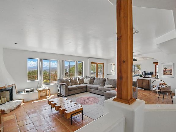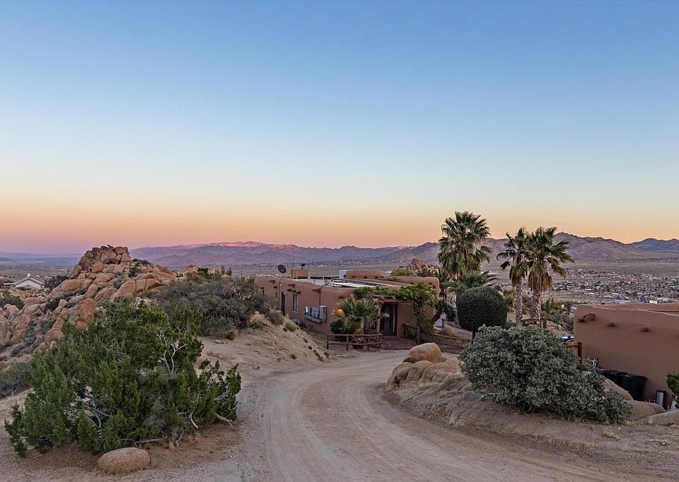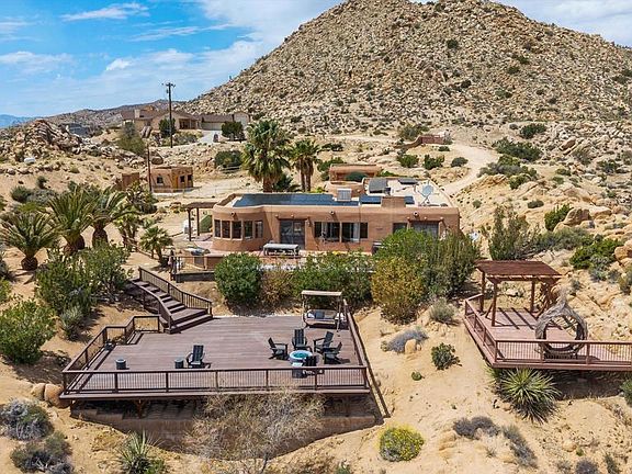 Privately nestled in a natural bowl, this adobe-style retreat is surrounded by sculptural boulders, rugged topography, and sweeping desert views.The living areas are grounded by warm Saltillo tile floors, bringing a sense of timeless character and ease.The kitchen and dining spaces offer a direct connection to the outdoors, with views framed by windows and light throughout the day.Two generous decks are set among the boulders, offering space to relax, dine, and take in the dramatic landscape.A detached garage provides secure parking, studio potential, or more, while an additional storage building adds flexibility and function.Native landscaping enhances the natural beauty of the setting, creating a seamless flow between architecture and terrain.Located on just under 2.5 acres and only minutes from Pioneertown and the west entrance of Joshua Tree National Park, this home is equally suited as a full-time residence, a weekend getaway, or a high-performing short-term rental.