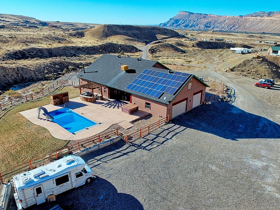 Views and seclusion abound at this 36.98 acre parcel bordering BLM in Palisade CO! Custom 3516 SF ranch home includes 3 bedrooms, 2.5 baths, living room, huge family room with fireplace, an upper 405 SF bonus room, large centralized kitchen with natural oak cabinets, stainless steel appliances, tile countertops & flooring. Master bedroom has private bath with tiled walk-in shower and a claw foot tub! A walk-in closet and door to back patio complete the master suite! Special features include Tuscan hardwood floors, a Rinnai boiler & tankless water heater, 2 full RV hookups, solar system, locally crafted ornamental iron, 3 car oversized finished garage & more! Entertain outdoors with hot tub, in-ground pool, and outdoor kitchen loaded with all the right tools! Perfect for the outdoor enthusiast with plenty of room for all the toys and access to public land!