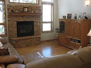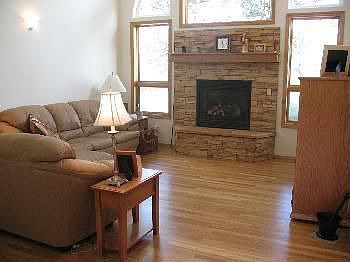 This home is absolutely charming on the inside and features upgrades throughout. Some of the upgrades include oak wood flooring throughout the living room, kitchen, and formal dining room and central air conditioning. The cozy living room has a stone fireplace, tall vaulted ceilings, and rays of bright light coming in from all the windows. The spacious kitchen has custom cabinets a breakfast nook, plenty of cabinet and counter space and around the corner there is a nice sized formal dining room. Located on the main level is the master bedroom with a huge master bath that has a jetted tub, double sinks and a separate walk in shower with dual shower heads. Upstairs, there are two bedrooms that share a full bath, a loft/sitting area, and a huge room that would be perfect for storage, a den, or office. Outside, the front yard has been beautifully landscaped with tall Ponderosa Pines and a stunning rock wall. Out back, there is a nice brick patio with natural gas BBQ. This is a must see!!