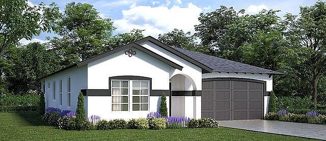 This newly constructed Smee Home, the Villa Sogno, is a dream house located on a corner lot in The Villas at Sierra Meadows in Porterville. The home has 1419 square feet of living space, an open floorplan, 3 bedrooms and 2 bathrooms with the master suite at the opposite side of the house from the other two bedrooms. Standard options and upgrades include a vaulted ceiling and high ceilings throughout, granite countertops in the kitched and on the kitchen island, white appliances, stained cabinets throughout, pantry, dining nook, laundry room, a large walk-in closet in the master bedroom, fully tiled master shower, chrome plumbing fixtures throughout, ceramic plank tile flooring and a covered backyard patio.