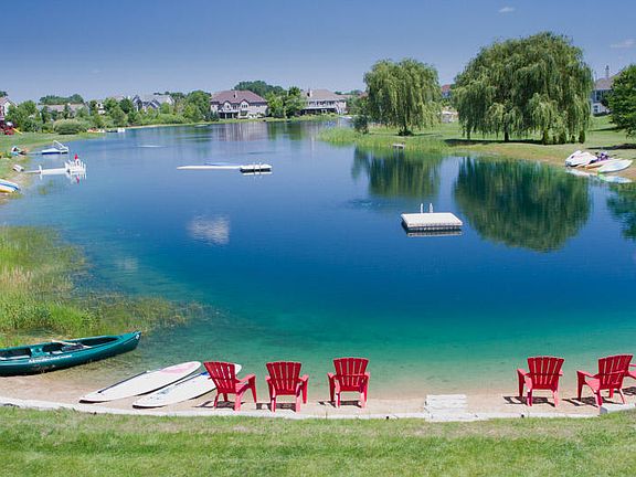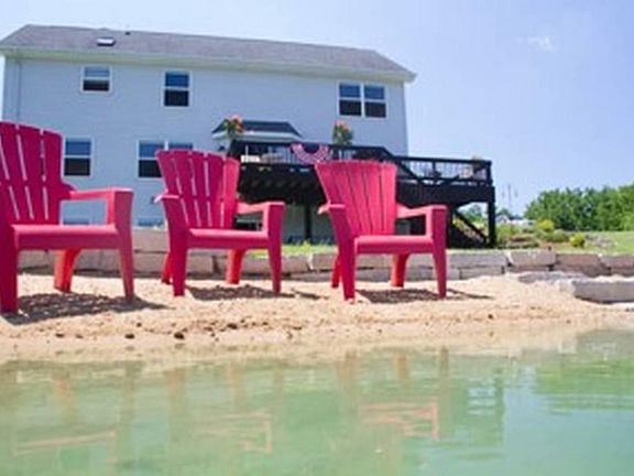 Enjoy this beautiful lakefront setting featuring 4BR/3.5BA home with finished walkout lower level in The Pines! Approx. 80 ft. of sandy beach swim frontage. Beautifully designed floor plan featuring front living room with hardwood floors and gas fireplace. Open kitchen, dining, and family room with lake views. New hardwood floors in kitchen. SS appliances included. Nice size upper level bedrooms. Master has vaulted ceiling and whirlpool tub. Huge family room and full bath on lower. Lakeside deck and patio!