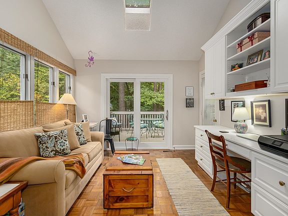 Fantastic Fearrington townhome with many updates, privately located in Weathersfield, backing to woods. With the primary bedroom suite (updated bath!) on the main level, this largest floor plan in Weathersfield includes a welcoming foyer, kitchen dining overlooking the front gardens, dining rm, family rm, sunroom and powder rm. Joyful kitchen with updated white cabinets, countertops, under-cabinet lighting, windows galore and plentiful storage. Spacious, open family rm-dining rm are perfect for entertaining. The 2nd floor includes 2 bedrooms with large WIC's, loft, full bath plus 2 room-size closets! This home's extra hall closet with plumbing, provides potential for a 3rd full bath or a laundry rm, on the 2nd floor. Enjoy relaxing on your front porch overlooking the flower gardens or on the nearly new back deck, nestled in nature. New sliding doors and a desk make the sunroom compete with the family room for your favorite indoor respite. Vaulted ceilings, skylights and picture windows bring natural light into every living space in this lovely, well-cared for home. See list of improvements.