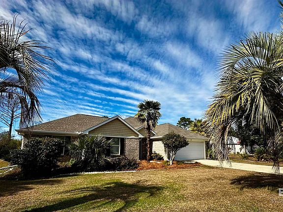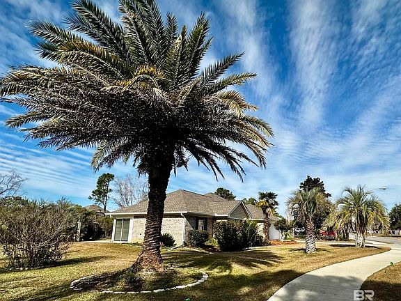 Check out the FANTASTIC price on this brick beauty on a double lot in the "Big Beach, Small Town" of Gulf Shores, Alabama. This well-maintained property is located at the end of a cul-de-sac and offers a perfect combination of comfort and style. With three spacious bedrooms, two big bathrooms and a bright, open living room, this home is perfect for both relaxation and entertaining. Large windows and vaulted ceilings throughout the home allow for plenty of natural light and showcase the beautifully landscaped yard that has mature palms, fruit trees and grape vines. The extra lot is ideal for outdoor gatherings and enjoying the glorious Gulf Coast weather. Plus it offers the opportunity to create another incredible outdoor living space with the possibility of a pool, gazebo or pergola. Keep your boat, truck or big toys in the oversized garage. High and dry and not in a flood-plain, but still located just minutes from brilliant white-sand beaches, coastal shops & restaurants, nature trails/state parks and a top 10 school system, this home is ideal if you're looking for a full-time residence or a vacation getaway. Don't hesitate! Buyer to verify all information during due diligence.