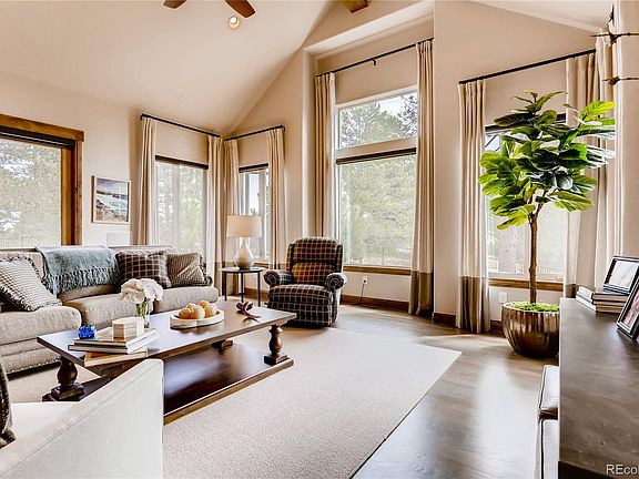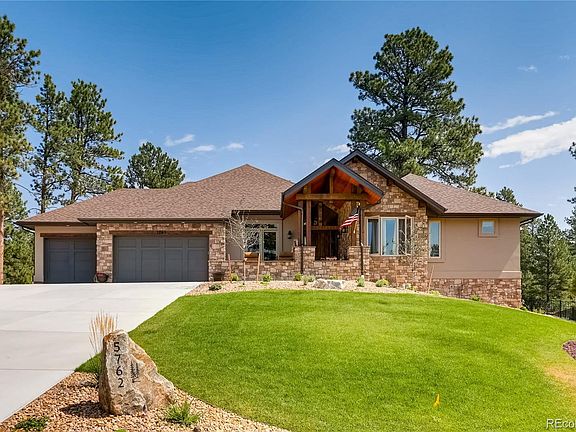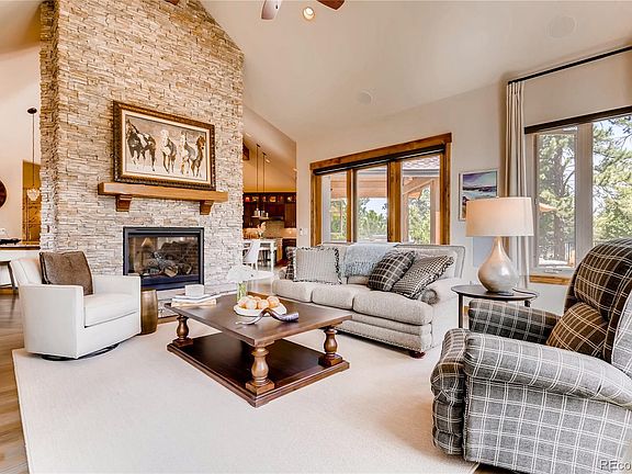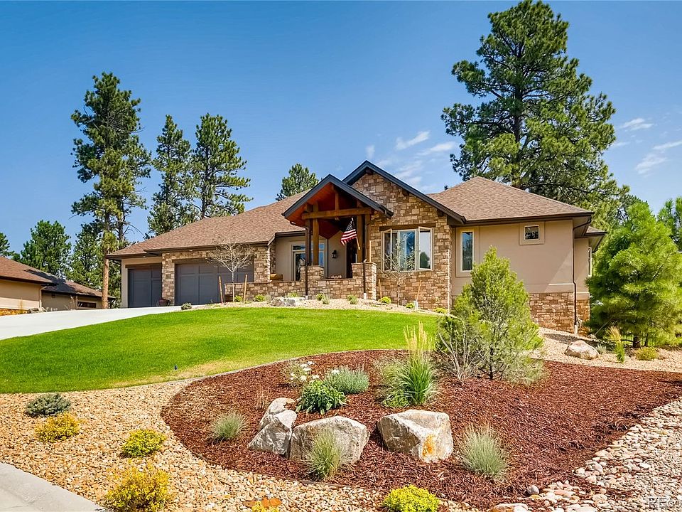 Situated on a half acre wooded lot adjacent to permanent open space featuring Pikes Peak views, this custom creation by renowned Timbers builder Kopasz Custom Homes doesnt disappoint. This ranch style home with finished basement checks all the boxes! On the main level, youll appreciate the stylish and accommodating master suite with sumptuous master bath; executive study with custom bookcase and woodwork and access to the covered front patio (with VIEWS!!); stunning dining room with custom wall covering, designer chandelier and adjoining entertaining bar; handy and functional laundry/mudroom; eat-in kitchen with gourmet appliance package, large island, fireplace, and designer finishes; and a drop-dead gorgeous great room with massive fireplace and room to entertain. The finished lower-level houses three additional guest rooms, three additional baths, custom wet bar, recreation room and ample storage. Outdoor entertaining is accomplished in style and privacy...you'll love your covered "outdoor kitchen", and a private, custom-built hot tub area! There's even a special access for your furry family member to visit the backyard--which is complete with a no-maintenance turf area! Consider the significant investment already made for you on professional landscaping, enhanced outdoor living spaces, designer window coverings, top of the line audio and video, etc., and youll see why this home is not only a showstopper, but a tremendous value! Show this one fast!