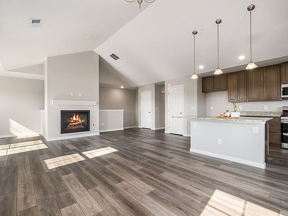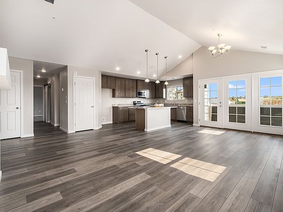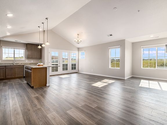 The front entry welcomes you up a staircase that leads you into single story living. The living and dining room are spacious and open, with the dining room giving access to the back deck. The kitchen includes a large island built with seating and an oversized pantry. The master suite includes dual sinks, a walk-in shower, and a walk in closet. The laundry room is situated between both bedrooms and includes extra room for storage.