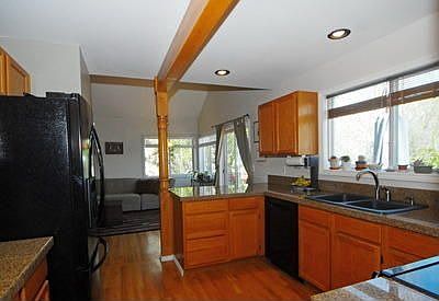 Super finished garden level basement w/bright windows + bar area, guest bed & bath. Amazing updates. Entire main oak floors. Granite tile kitchen, black/black appl, all baths updated w/designer tile & colors, new light fixtures. Vaulted formal living room with wall of bright sunny windows & formal dining. Backs to open space! Low maintenance yard w/creek. Quiet & peaceful. Front porch & back deck. Cul-de-sac. Neighborhood park & nature trails right outside your door.