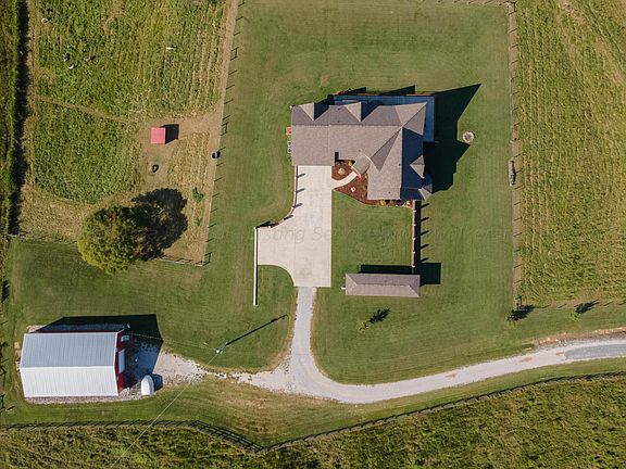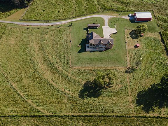 This beautiful home sits on a hilltop on 6+/- acres with a view from the windows in the family room that reach 40'+/-. The front door opens to a dome ceiling and a beautiful staircase flowing from each side of the center. There are 4BR, three full baths and two 1/2 baths. Well constructed. Per seller, the walls are 6'' poured concrete. The house is gorgeous, but the exterior is equally as gorgeous. It has a pasture, barn, large workshop and storage shed. Listed at the end of photo section is many other amenities. Also check out the video.