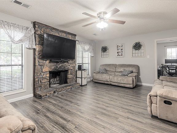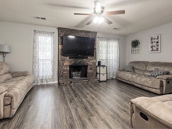 NO CITY TAXES!! UPDATED - LAM. WOOD FLOORS, TILE BATHS, COZY STONE FIREPLACE IN GREAT ROOM, WALK IN CLOSET MASTER SUITE, SPLIT BEDROOMS, NEW WATER HEATER, LEAVING REFRIG. WASHER & DRYER. Large Fenced backyard, WIRED MORGAN BLDG, Driveway Extended behind privacy fence, for extra vehicles. COVERED PATIO. Church Camp Owns Wooded Land Beyond Back Yard, Termite Contract, Well Kept Home. Sellers transferring. Love their home and it shows. Many unique features that stay like entry coat rack built in