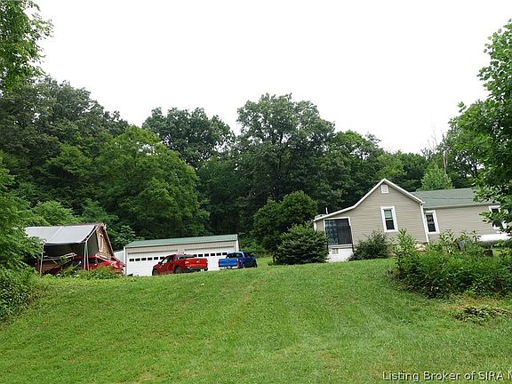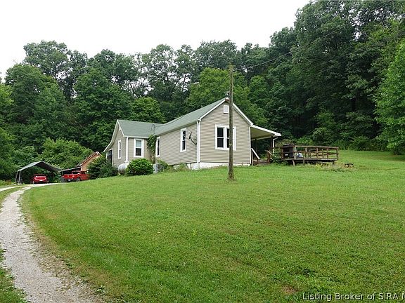 Great location off on Budd Rd in New Albany. This home has 5.64 picturesque acres nestled in and surrounded by trees of all kinds. There are Persimmon, black walnut, peach, pear and apple trees throughout the lot! You will love seeing all of the natural wildlife this area has to offer. The home is in need of updating but the space is great and ready for the next Owner to update it to their liking. The home has 3 beds and 2 baths and an unfinished basement and a cellar. There is a massive 4 car detached garage with a lift that stays for the mechanics dream garage. Also this property has a lean to and a crafting shed that can be converted to a play house, she shed, etc. There is a dirt road that takes you back to another pasture in the back of the property. Also there is a creek that runs though the back/middle of the property easily accesible from the gravel road.