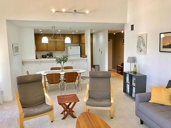 This furnished apartment is in an amazing location! Quick access to freeway and trolley, minutes away from Fashion Valley & Mission Valley malls. Resort-like complex features 2 pools, spa, tennis courts, racquetball, peaceful fountains/ponds and discount at the YMCA next door.Garaged parking for one car plus plenty of street parking for additional vehicles. Corner top-floor unit with high ceilings. Rent includes hot and cold water, and renter's insurance. Tenant pays wifi, gas and electric.
