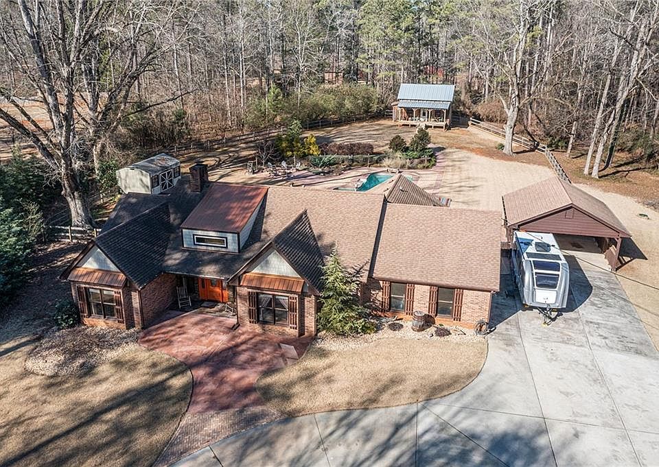 2-HOMES in one with more than 5 acres. The main house is a three-bedroom, two-bathroom split floor plan, including pecan-hardwood and tile floors. Kitchen features include granite countertops, Solid maple cabinets, a Built-in coffee maker with its own waterline, a Trash compactor, and includes a dining area and is adjacent to the den. The Owners suite comprises a large bathroom, walk-in closet, and an exterior door leading to the back patio-2 more spacious bedrooms on the opposite side, sharing the other full bathroom. The great room features windows stretching across the back and a brick fireplace. You'll see plenty of parking for entertaining friends and family at the roundabout in the front. The 2nd home, "The Cottage", is entirely independent of the primary residence and includes its full kitchen, and 3rd full bathroom & laundry room, Hardwood floors, a Covered porch, and a 4th-bedroom in the loft. The primary home features four side brick, a saltwater POOL, a Huge covered patio with 5,000 sqft of stamped concrete, a firepit, a 2-car garage, and a 2-car port with tons of storage.