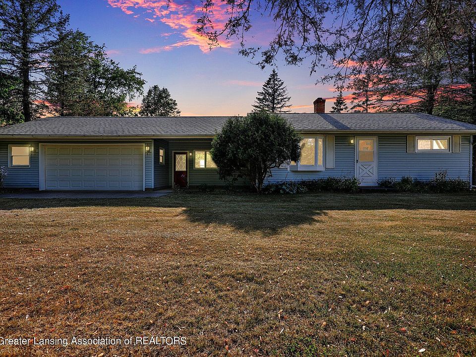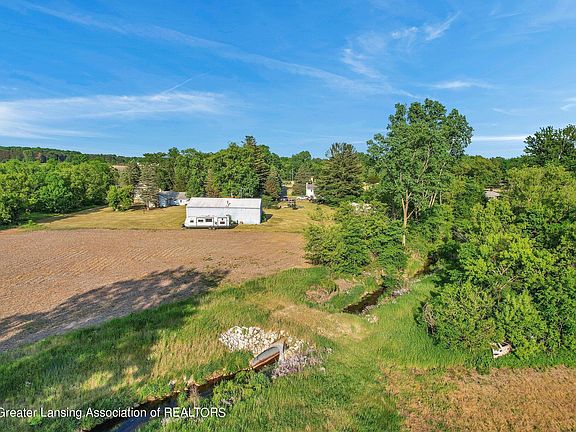 2 bedroom, 1.5 bath ranch in Dimondale on over 12 acres. Enjoy a Great Room with fireplace, family room, kitchen, dining and full bath within the home. In the breezeway between the home and the garage is a conveniently located A½ bath for use when working outside. The lower level with second fireplace could easily be finished, doubling your living space. The heated and insulated barn comes complete with a 7000lb Ammco lift, chainfall and compressor with hose installed along the walls for ease of use. With an attached 2 car garage and additional storage barn in front of the home, there is not shortage of space! This property is so much more than a home on land! The sellers are currently leasing the farm land and renting out indoor and outdoor space for RV storage which are both great ways to generate income.