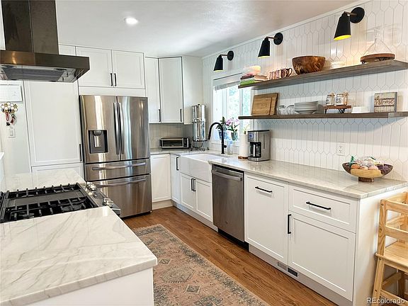 Beautifully updated brick ranch in desirable Cloverdale neighborhood! The open concept floorplan is bright and inviting. The upscale kitchen is spacious and includes a gas stove, stainless steel appliances, custom quartzite countertops, floating shelves, and ample prep and storage space. This home also features hardwood floors throughout, fully remodeled bathrooms, custom built-ins, Nest thermostat, an updated electrical panel, new water heater, mature landscaping and much more. You'll find the primary bedroom with it's own 1/2 bath and two more good sized bedrooms on the main level. Downstairs you have TONS of equity opportunity with a full unfinished basement to customize how you see fit! Located close to restaurants, shopping and public transit. Only minutes from Belmar complex, downtown and the mountains are just a short drive away!