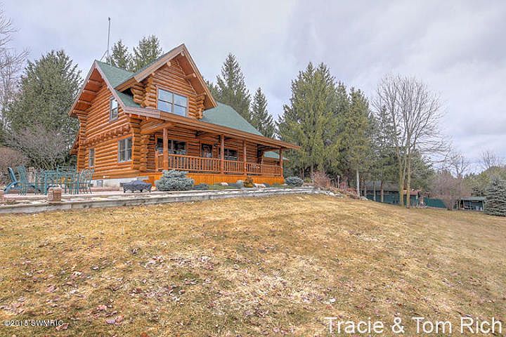 First time offered for sale. Expertly maintained full log home on 20 acres of paradise. Includes expansive views of more than 1500 feet of the Flat River running through the property. 4 bedroom, 2.5 bath. Open floor plan with huge main room with open loft family room above. Second floor master with private bath. Large kitchen with bar eating area. Multiple outbuildings. Property has been managed for deer and game birds including pheasant, quail, partridge, and turkey. Floor and vegetable gardens including several raised bed gardens. A fruit garden that includes Apple, Pear, Blueberry, Gooesberry, Grapes, and Currants. Workshop outbuilding includes integrated Chicken coop. Private setting with incredible views and room to roam. Unique home and property. Call today for private showing