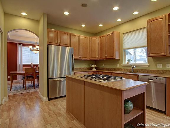 Minutes from Kincaid park sits a must see home w/large open kitchen, granite counters, stainless appliances & stylish wine bar, expanded deck w/great afternoon sunshine & separate fenced dog run, upper floor has master suite w/mountain views, walk-in closet & jacuzzi tub plus 3 roomy bedrooms! Tons of other features like recessed lighting, pergo flooring, huge garage & standup crawlspace! 5767 Cobbler Drive 2,476sf, 4bedrooms, 2.5baths, 2+ garage, 8,000+sf lotKara and Dave had the home built in 2003, modified to their individual tastes and have made other upgrades throughout the years. LOCATION AND EXTERIORHome is oriented for great sun exposure! Backyard & master bedroom get morning sun, front of house gets sun during the day (melts the snow off the driveway), and backyard gets late afternoon and evening sun.Huge back deck with lots of room for entertaining.Deck & side yard are gated and fenced as separate dog run area so you are safe to "let the dogs out"Custom landscaping, planting beds and flowering perennials.Flat & level drivewayX-large 2 car garage w/personnel door to outside.Standup height crawlspace w/storage racks accessed from garage.New trex decking on front deck and stairsStorm door with interchangeable glass or screen for fresh air & no bugs. KITCHENRoomy kitchen with tons of counter space and custom honed granite.Custom wine bar area with wine fridge42" cabinets w/undercabinet lighting and crown molding.Stainless appliances including Bosch dishwasher, double ovens ( microwave is also convection oven), 4 burner gas cook top, and the fridge stays :)Pergo flooring throughout kitchen, breakfast nook, & dining roomUPSTAIRSMaster bedroom has custom privacy window with views of the Chugach mountain range and morning sunshine.Master features large walk-in closet, Jacuzzi tub and his and hers sinksBedrooms have top down bottom up black out blindsLaundry area with folding table and large linen closetAll bedrooms are good size and have mirrored closet doorsOTHER FEATURESHunter Douglas Silhouettes in living & dining rooms, Hunter Douglas Duettes in Family room, Kitchen & Breakfast nook area.Whole house surround soundRecessed ceilings in master bedroom and dining roomTons of recessed lighting throughout homeWi-Fi enabled thermostat for heat control from your phoneCentral Vac & attachments4* Energy rated