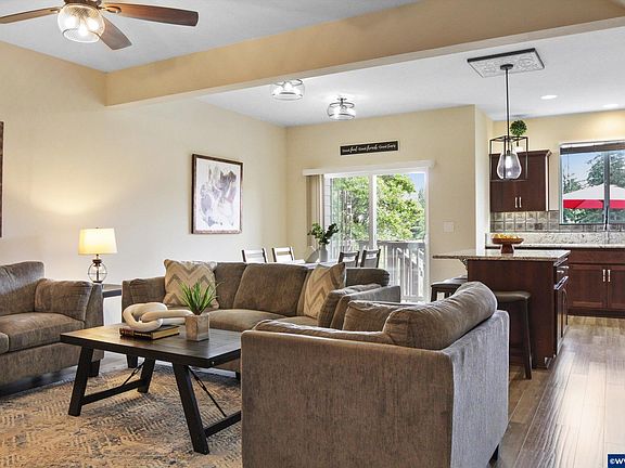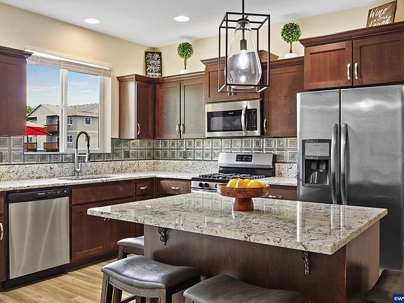 Delightfully updated 3 bed/2.5 bath South Salem townhome. Kitchen features slab granite counters, SS appliances, gas range, island w/ eating bar, pantry and extra storage behind charming barn door. Laminate flooring, Spacious primary BR and ensuite bath; upstairs laundry & roomy loft. Beautiful views of green space from composite back yard deck. Drip irrigation & solar lights. Landscaped & flowers galore!