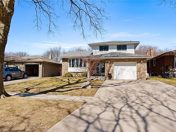 Location location location! Gorgeous quiet crescent in north end Niagara Falls, this large multi-level awaits the next family to make it home. Wonderful curb appeal from the street with handsome stone facade, concrete driveway, and welcoming sit-out front porch with double doors. Traditional layout inside featuring living room & family room w/ gas fireplace, formal dining room and eat-in kitchen overlooking the backyard. Original hardwood floors throughout, solid wood stairs, and newly installed hardwood in the family room. The lower level boasts a second full kitchen with gas stove, large rec room, 2nd full bath, cold room, and a ton of storage space. Private backyard with large garden and patio, replaced roof shingles 2011 (50 year shingles), furnace 2020, and updated windows, this home makes a wonderful family home here in Niagara in one of the best neighbourhoods around!