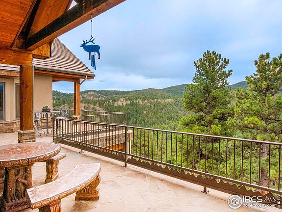 A regal home in Evergreen sets the standard in mountain home luxury on 18.5 acres with 360 views of the Rockies, Mt. Evans stuns in particular. A private paved road takes you to the home. The main entrance mimics the grandeur of the mountains and reveals an expansive floor plan generous in space, light, and incredible views. The gourmet kitchen is a chefs dream, featuring custom cashmere hickory cabinets, granite countertops, two islands, 6 burner cooktop, dual convection ovens, and walk-in pantry. The home is tastefully designed with petrified wood floors, tall ceilings and a range of incredible details that resonate with the spirit of nature. For such a grand home, there's no lack of intimacy and it offers plenty of spaces to cozy up during the winter months. The lower level is great for entertaining and includes a custom wine room with wormy maple/mahogany accents and custom stone water feature that acts as the whole house humidifier. The primary bedroom has sprawling views, a stone fireplace, and an en suite that is a masterclass in detail from the petrified wood of the central drop-in bathtub and the custom cut glass of the walk-in shower. All bedrooms feature walk-in closets, central lighting, private granite en suite bathrooms. The office has great views, built-in bookshelves, and a fireplace to keep you warm. Amenities on the wraparound deck include an outdoor fireplace and kitchen perfect for year-round use. Huge oversized 7 car garage with RV parking, space for a workshop, and living quarters upstairs; complete with a bathroom and kitchenette. There is an outdoor pond with a waterfall, a custom built hot tub, and ample parking. No HOA lets you take charge and express your vision throughout the property to make this a deeply personal property. Utilities include a direct natural gas line, high performance well, free high speed internet, and 400 amp electrical! This is a breathtaking, class-of-its-own home on a staggering piece of Rocky Mountain property.