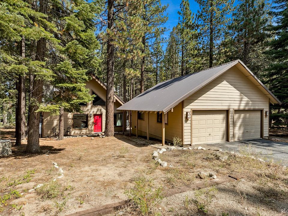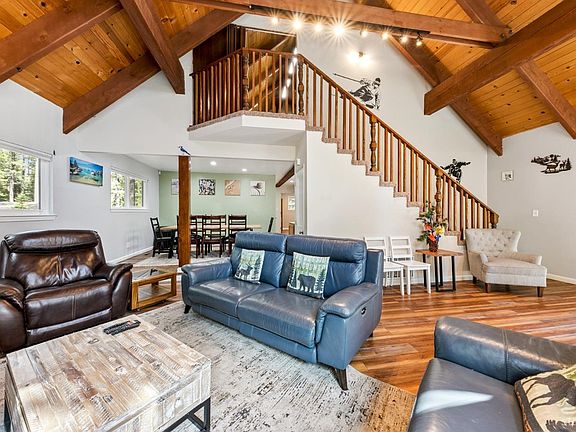 Discover this recently updated chalet on an expansive 12,197 square foot lot, adjacent to a Forest Service parcel with nearby access to miles of scenic hiking and biking trails. This thoughtfully renovated three-bedroom, two-bathroom home features a spacious loft and large detached two-car garage. This mountain home is sold furnished per inventory list including custom log beds, reclining leather sofas, and new washer/dryer, and refrigerator. The inviting living area showcases vaulted open beam ceilings, abundant natural light and a new gas fireplace complemented by waterproof vinyl flooring throughout. The updated kitchen has quartz slab counters, stainless steel range and hood, plus a convenient breakfast bar perfect for casual dining.The main level hosts two bedrooms offering tranquil forest views, enhanced by LVP flooring and recessed lighting. The completely renovated downstairs bathroom features quartz tile, a relaxing soaking tub, separate stall shower, and stunning dual sink vanity.Upstairs reveals the third bedroom alongside an updated full bathroom and generous loft space, currently utilized as both a game room and fourth sleeping area. Recent quality improvements include energy-efficient dual pane windows, on-demand water heater, shaker interior doors, and additional modern upgrades.The South Lake Tahoe neighborhood offers exceptional access to outdoor recreation. This location combines mountain living with practical amenities, creating an ideal retreat for those seeking both adventure and comfort in one of California's most desirable mountain communities.