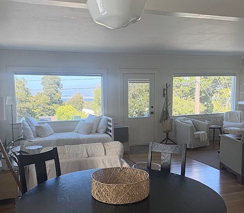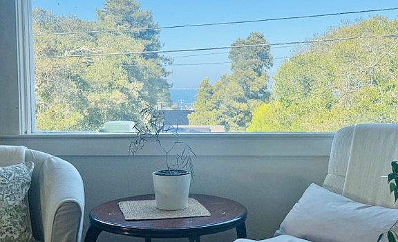 Charming, renovated, furnished 1 bedroom/1 bath upper unit of home available July 1 for a 6 month - 1 year lease. Hardwood floors throughout. Please--no animals/no smoking. Rent for 1 person is $2895/month plus utilities. Perfect for a full time home or weekend retreat. Enjoy refreshing blue vignettes of Monterey Bay and surrounding greenery from this peaceful home located in sunny New Monterey on a relatively quiet residential street. Furnished in a warm, simple organic style- ready for your personal touches. Very open and spacious (almost 900 square feet). Front great room has several seating areas and a formal dining room. Home has been renovated while maintaining the original 1920's charm and character--very bright and sunny with lots of windows. Front porch with a few chairs and table is a great place to relax and take in the morning sun. Well designed kitchen features walnut countertops, quiet Bosch dishwasher, French door refrigerator, Kitchen-aid 5 burner gas cooktop, and lots of storage space in the custom craftsman cabinets. Large living room has 2 seating areas--one is around the classic fireplace (updated gas) with built in side bookcases, and the other side features an oversized club chair and daybed to relax and enjoy the views. Dining area seats 4-6 with an expandable table. Space for a desk in dining area if needed for remote work. The sunny bedroom suite features a comfortable queen sized platform bed and cozy side chair. There are 2 walk in closets with ample storage, shelving and approximately 15 feet of rod/hanging space. Large updated bathroom has a soothing retro cast iron tub, overhead shower, restored mid century azul blue tile, long vanity cabinet and mirrored cabinet with lots of storage. "Furnished" includes furniture/rugs/lamps/art/mirrors/some linens/throw pillows only (not "turn key".) Just bring your clothes, linens, personal items and kitchen gear and you will be set! Possible shared Laundry area and potential on-site parking available for a small car, please inquire. There is also available street parking, no permits required. There are beautiful walks to several neighborhood parks nearby. Public Tennis courts are a block away. Centrally located, so only a few minute drive to Trader Joes, Asilomar Beach/boardwalk, 17 mile drive, Pebble Beach, Cannery Row, the Aquarium, and great Pacific Grove and Monterey restaurants. Sorry, no animals (due to Owner's documented severe allergy.) Other than the storage mentioned in closets/cabinets, there is no other available storage areas in or on site. There are 3 outdoor sets of stairs to get up to the front door (but the views are worth it!) Excellent credit, references and sufficient verifiable income/assets required. Thank you for your interest! Lease term is from 6 months to 1 year. Utilities (PGE, water, internet, garbage) are not included in rent and are shared with other unit. No animals/no pets/no smoking of any kind on or inside the property. Renters insurance required (Minimum of $50k contents to cover furnishings and 300k liability with Landlord names as additional insured.) Gardener included.