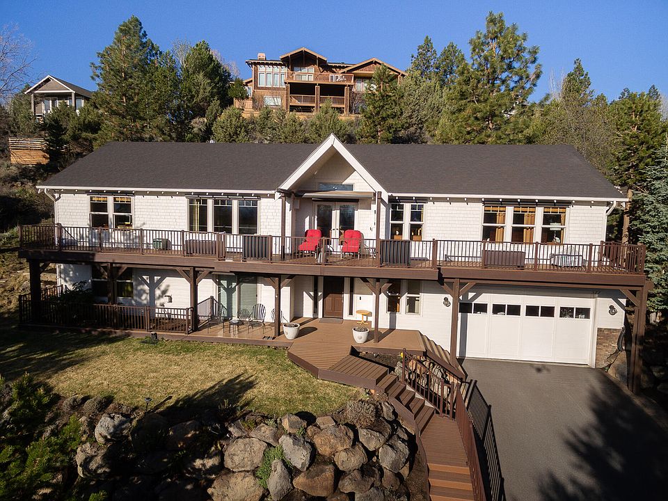 With panoramic city and Ochoco Mountain views, this meticulously crafted home in Bend's highly desirable West side offers the ultimate enjoyment of life. The lower level could double as a guest apartment with a bedroom & full bath, living area with a gas fireplace, & wet bar with mini fridge. Upstairs, the great room features a vaulted ceiling and a wall of windows to enjoy the panoramic views and access to the expansive Trex deck with retractable awnings. The remodeled kitchen with a sleek granite island and stainless appliances, opens up to the great room with a dining area & beautiful living space. Enjoy separation of space with two additional bedrooms & full bath opposite the spacious primary suite with a large walk-in closet, double vanities & jetted tub. The back patio offers privacy and beautiful perennial flowers for the aspiring gardener. Remodeling also includes new hardwood flooring, lighting, Trex decking, retractable sun shades, gutters, roof, exterior paint, HVAC & more.