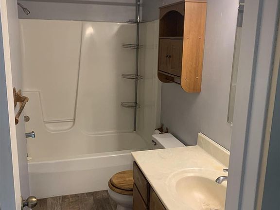 2 Bedroom home with vinyl siding, updated windows and kitchen! A 16x20 single stall garage and a 32x42 pole shed with concrete floor with a 12x16 heated office area all on nearly a full acre. The Hickory cabinets in the office are included!