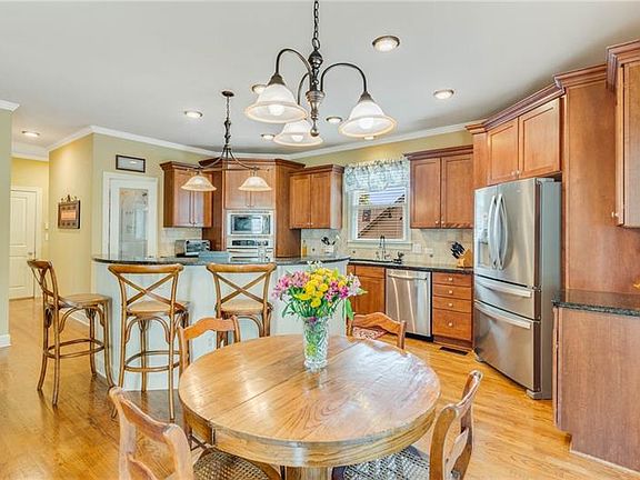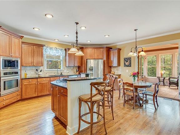 - Kitchen Features: Breakfast Bar, Cabinets Stain, Eat-in Kitchen, View to Family Room, Stone Counters, Kitchen Island, Pantry Walk-In