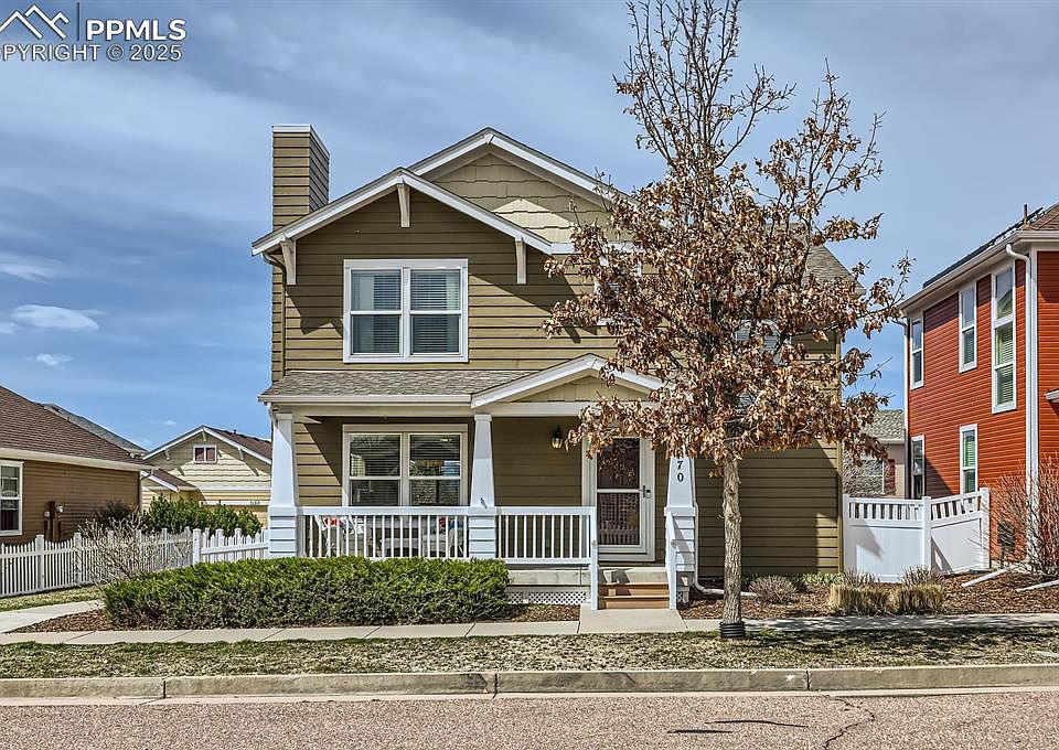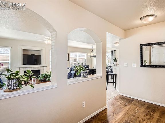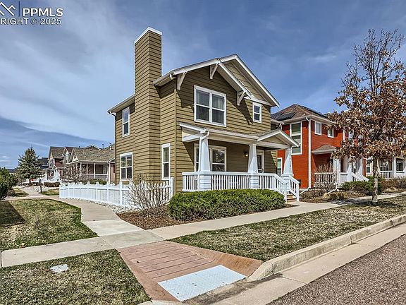 Welcome to your bright, open, and move-in-ready home * Experience breathtaking Pikes Peak views from two of the three bedrooms, including the spacious primary suite * As you step inside, you'll be greeted by beautiful hardwood flooring that flows into a charming, newly updated kitchen, complete with a pantry, ample new cabinetry, and a gorgeous tile backsplash & generous space on the granite countertops * The inviting open floor plan is perfect for entertaining friends and family, featuring large windows that fill the space with natural light, a cozy gas fireplace in the living room, and a sunny dining area that leads to a delightful walkout patio and a breakfast bar for casual meals * With the HOA taking care of the front landscaping and an automatic sprinkler system in place for easy backyard maintenance, you can enjoy more time relaxing and less time worrying about upkeep * A lovely sidewalk borders the south side of the home, perfect for evening strolls through this friendly neighborhood, which boasts grassy common areas for everyone to enjoy * Don’t miss out on this MUST-SEE gem!