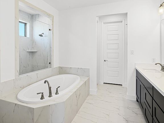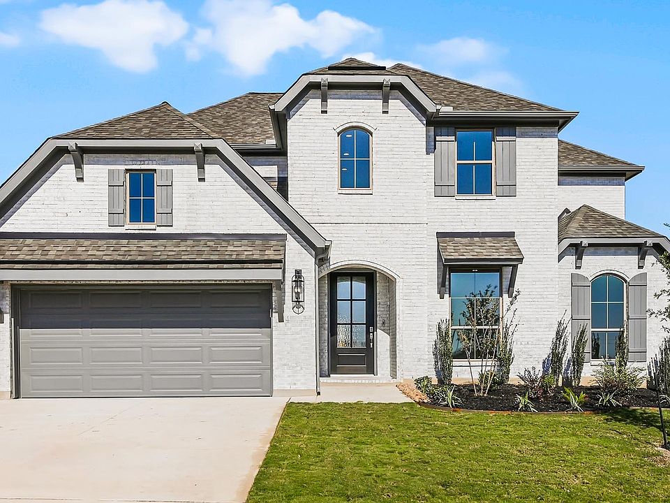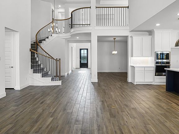 MOVE IN READY! Home office with French doors set at two-story entry. Formal dining room opens to curved staircase. Kitchen and morning area open to two-story family room. Kitchen features generous island with built-in seating space, two wall ovens, 5-burner gas cooktop. Family room features a wood mantel fireplace and wall of windows. Primary bedroom features 12-foot ceiling. Primary bath includes dual vanity, garden tub, separate glass-enclosed shower and oversized walk-in closet with access to utility room. A second bedroom is downstairs. A game room, media room and secondary bedrooms are upstairs. Extended covered backyard patio. Mud room off three-car garage.
