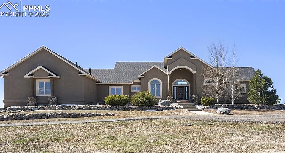Your Private Colorado Retreat Nestled on over 35 acres with panoramic Pikes Peak views from nearly every room, this elegant home offers the perfect balance of privacy and proximity—just minutes from town. The light-filled great room features a cozy fireplace and mountain vistas. The kitchen includes a 5-burner gas island cooktop, built-in grill, warming drawer, custom cabinetry, and an eat-in nook with unobstructed views. A formal dining room with high ceilings and a view of the front pasture adds an elegant touch. The Owner’s Suite offers a private fireplace and spa-style en-suite. A second main-level bedroom, spacious laundry room, and thoughtful layout complete the main floor. The finished walk-out basement is ideal for entertaining or multi-generational living, with three en-suite bedrooms, a second full kitchen, dining space, and a third fireplace—all with continued mountain views. Equestrian features include fenced and cross-fenced pastures, loafing shed, 2-stall barn with tack room (room to expand), oversized RV garage door, 4+ vehicle parking, and plumbed water and electric throughout. Recent upgrades: new wood flooring and carpet, roof, deck railing, interior/exterior paint, remodeled Owner’s bath, new sprinkler system, new road base, and more. A rare opportunity to own space, luxury, and Colorado beauty in one remarkable property.