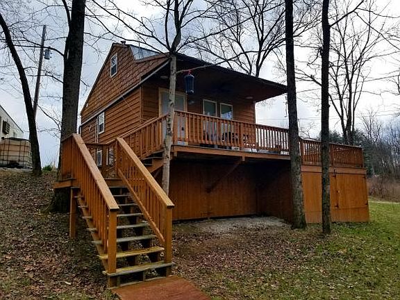 The cedar sided cabin is setting on .81 of an acre right on Laughery creek. 16â x 20â 320 sqft first floor, with 192 sqft loft. Walk out concrete basement, 1,000 gal concrete cistern. Mini split system for heat and A/C. Kraft-maid cabinets with stained concrete countertops. Electric cooktop with over range microwave. Stainless fridge. Deep double bowl composite under mount sink with touch-less faucet. Hardwood flooring in kitchen and living. bathroom, with fiberglass shower, waterless urinal, composting toilet. Two RV electrical hookups.