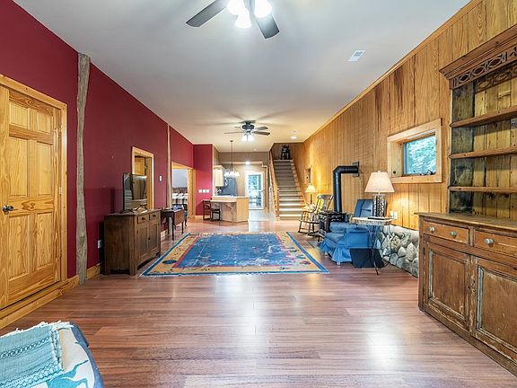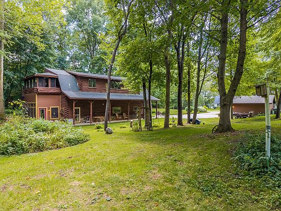 Escape to tranquility in this impressive 3-bedroom, 2-bathroom log home nestled on 11.42 acres of lush woodland, complete with wetlands and abundant wildlife. Spanning 3,000 square feet, this spacious retreat offers rustic charm and modern convenience. The main level features a cozy living room with a freestanding Vermont Casting gas heater, gleaming hardwood floors, and an open-concept kitchen with breakfast bar, built-in storage, pantry closet, and all appliances included. A bedroom, full bath, enclosed porch, laundry room, mechanical room and access to the walk-up attic storage complete the main floor. Upstairs, enjoy a generous family room with a second kitchen—perfect for guests or multi-generational living—plus two additional bedrooms, a full bath, and another enclosed porch for year-round enjoyment. One of the bedrooms has the closet just outside the door. Outdoors, you'll find an attached 10x12 carport, 24'x24' detached garage, a 20'x12' shed, and an 8'x10' shed for all your storage needs. Whether you're watching deer from the porch or exploring your private acreage, this property is a true haven for outdoor enthusiasts. Peace, privacy, and endless possibilities await. New sewer system is coming and the grinder is in place. Seller currently pays $40./month for sewer. When sewer is complete owner will be responsible for hook-up from house to grinder, crushing the septic and the sewer bill will be increased to $75.65 per month.