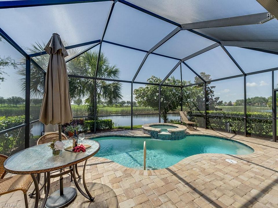 H.14698 - Upgraded "Taft" model w/Heated Pool/Spa on Premium Lot with spectacular Water & Golf Course views. 2 Bedrooms + Den/Office. Master Bedroom has sliding doors to pool area and 2nd Bedroom and Den/Office are equipped w/Custom Murphy Beds offering many options for your living spaces. Impact Windows and Electric Shutters offer security and storm protection.The 2-car Garage has Utility Sink w/Overhead Shelving. Upgraded Maple Cabinets, 6 Ceiling Fans, Pendant Lighting in kitchen w/ Stainless Steel appliances, Granite Counter Tops. Diagonal Tile throughout the home. Crown Molding and Plantation Shutters, Upgraded Shower in Second Bath, and Custom Closets. Exterior Pavers have been specially treated on the driveway and screened in lanai/pool area. Front porch has also been attractively screened w/custom glass door at the entrance of the home. Property deeded Golf Membership $14,000 value. Del Webb is a 55+ community complimented by 18 hole Championship Golf Course, Oasis Club Resort Center, with state of the art Fitness Center, Sauna/Steam Room, Pickle Ball/Bocce/Tennis Courts, Resort Style Pool/Lap Pool. NOTE: LISTING AGENT IS SELLER and golf membership can be optional.
