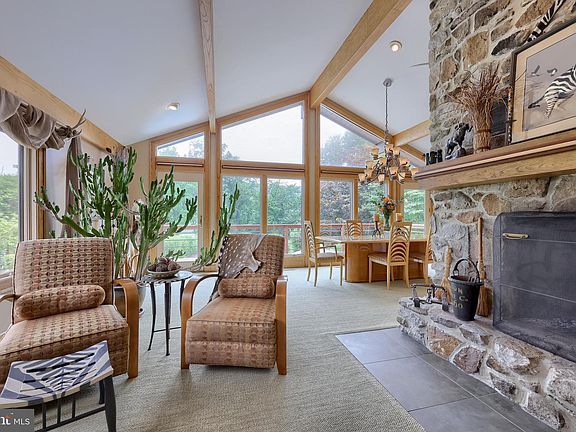 Nestled in a tranquil, park-like setting with sweeping views of lush fields and mature woodlands, this stunning 3-bedroom, 3-bathroom rancher offers a perfect blend of luxury, comfort, and natural beauty. The open-concept main level welcomes you with a gourmet kitchen featuring rainforest marble countertops, high-end stainless steel appliances, a 48" Thermador gas oven/range with hood, a breakfast nook, and a center island complete with a sink and built-in steamer - ideal for culinary enthusiasts. The formal dining room is flooded with natural light from expansive windows that frame panoramic vistas, while the vaulted ceiling with exposed beams adds architectural charm. Step into the living room and relax by the freestanding stone wood-burning fireplace, or retreat to the spacious primary suite with a walk-in closet, jetted tub, and spa-like ensuite bath with custom stone and tile walk-in shower. A second main-level bedroom with built-ins and a full bath just across the hall offers comfort and flexibility. Downstairs, the fully finished lower level is an entertainer’s dream. Enjoy gatherings in the bar room with a full wet bar and wine storage, or relax in the family room with built-in shelving and easy access to the patio and pool area. A third bedroom with walk-in closet can easily transform into a private office or creative space, and a full bathroom with walk-in shower ensures convenience for guests. Additional features include a well-appointed laundry and utility room, as well as ample hidden storage throughout. Car enthusiasts and hobbyists will appreciate the expansive garage options: an attached 2-car garage with a mudroom, plus two heated detached garages; one a 1-car with dog kennels (easily convertible to a 2-car), and the other a 3-car garage with one finished bay ideal for bonus space or lift installation. Outdoors, unwind on the wrap-around deck overlooking a large in-ground pool and beautifully maintained grounds, perfect for hosting summer barbeques. A dedicated outbuilding offers workshop space and storage for lawn equipment, much of which is available for purchase, making this a truly turnkey property. With a new roof, recently updated HVAC systems, and a generator hookup ready for emergencies, this home offers the ideal combination of modern comfort and peaceful, rural living. Schedule a private showing today to experience it all for yourself! No trespassing; showings by appointment only. Please note that video surveillance and security systems are on property for your safety. Seller requires occupancy of 2 months post-settlement.