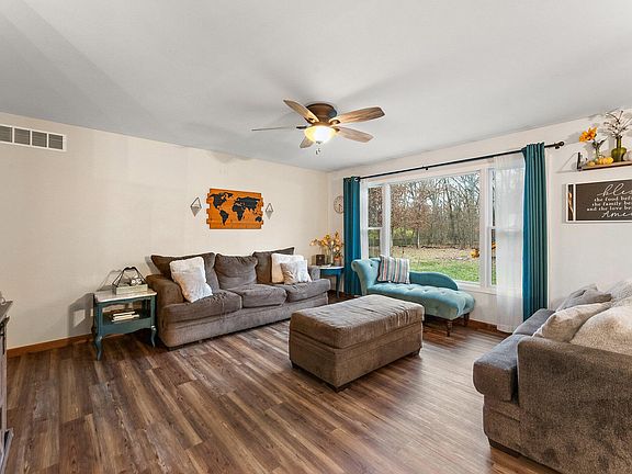 Nestled at the back of a serene subdivision, this 3-bedroom (with potential for a 4th!), 2-bathroom home offers the perfect blend of modern amenities and natural beauty. From the moment you arrive, you'll be captivated by the home's charming curb appeal and the lush, partially wooded lot. Cook like a pro in your newly updated kitchen, featuring modern finishes and energy-efficient upgrades. Enjoy the warmth of natural light streaming through big Anderson picture windows, offering breathtaking views of your scenic surroundings. Step outside to your private retreat featuring a Cedar deck, new fire pit, and a backyard blooming with perennial flowers --daffodils, tulips, irises, peonies, and lilies! Harvest your own fruit from the red and yellow apple trees, pear trees, blueberry bushes, grape vines, and blackberries. A walking trail completes this nature lover's dream. A sprinkler system keeps your yard in pristine condition, and the heated garage provides comfort in colder months. The home includes a cement-floored crawl space with a newly sealed rim joist, ensuring lower energy costs. There is also tons of new shelving in the heated garage. Schdule your showing and come check out all this property has to offer.