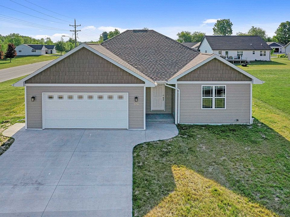 This gorgeous 3 BR, 2 BA ranch features open concept kitchen & living room w/cathedral ceilings. Kitchen has beautiful custom maple cabinets, SS appliances & center island. The foyer opens into the large, bright living room, master bedroom has a large walk-in closet, en-suite bathroom & a step tray ceiling. Don't miss the first floor laundry near the entrance to your 2 stall attached garage. The basement is waiting for your vision, it is already stubbed for a lower level bathroom. Enjoy the large yard (.30 acres), w/trenched downspouts, from your large patio. Make your appointment today, this gem won't last long. Seller requires a 60 day closing.