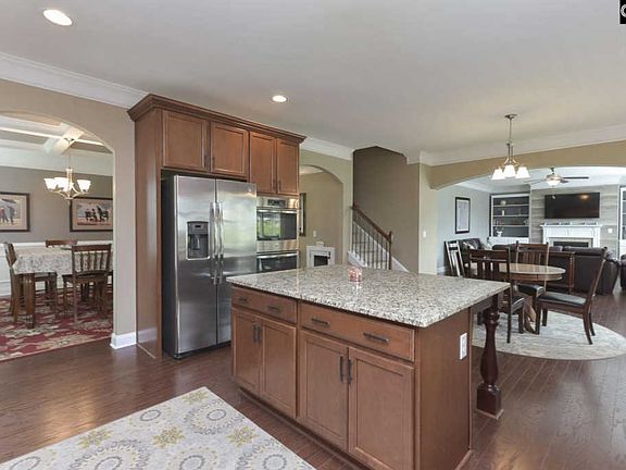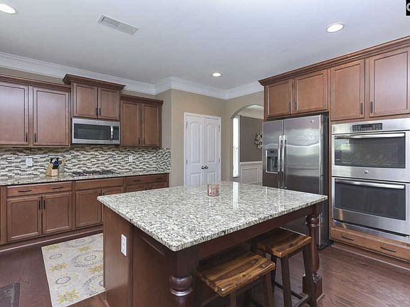 - RoomKitchenFeatures: Granite Counters, Kitchen Island, Pantry, Recessed Lighting, Eat-in Kitchen, Floors-Hardwood, Cabinets-Stained, Backsplash-Tiled