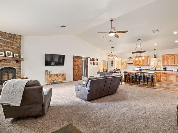 - Breakfast Bar, Ceiling Fan(s), Double Vanity, Enclosed Toilet(s), Kitchen Island, Linen Closet, Open Floorplan, Pantry, Primary Downstairs, Shower/Tub Combo, Soaking Tub, Stone Counters, Tile Shower, Vaulted Ceiling(s), Walk-In Closet(s)