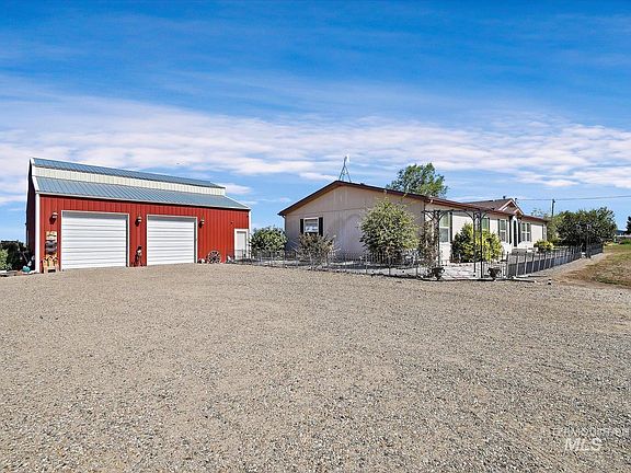 Unique opportunity to buy this 1 owner Kuna acreage property! Situated on two tax parcels with a total of 2.45 acres and multiple buildings, the possibilities are endless! The main home was manufactured in 2005 and features a beautiful spacious kitchen with solid rustic hickory wood cabinets, black granite sink, chef's faucet, and a huge amount of counter space making this a dream kitchen to entertain in. 2 bedrooms, and an office/den on one side and your primary suite on the other with an amazing en suite featuring dual vanities and garden jetted tub. 3 full bathrooms! Great room with a gorgeous propane fireplace accented with wonderful stone work to keep you cozy all through winter. 30x40 Garage shop with 220 plug ins, vapor sealed, wood stove, cooler, and automatic garage doors. 2 dedicated RV towers with 30 & 50amp, and sewer conn. No HOA! Too many features to list!